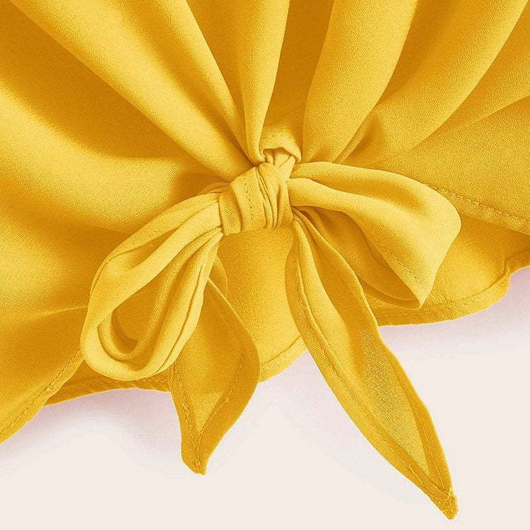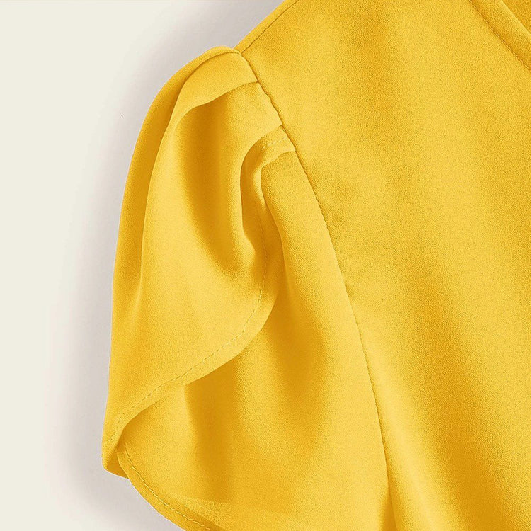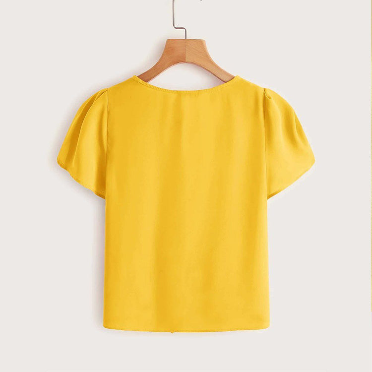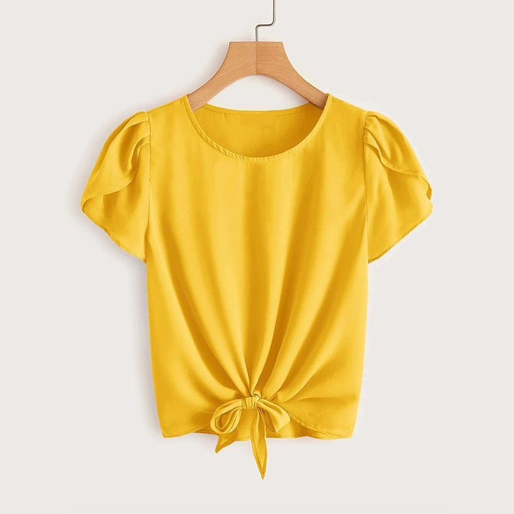 A graceful double georgette top consisting Tie Front, in Yellow color with petal sleeves and a round neck.