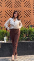 White high waisted pants with pronounced seams. Front welt pockets. Front zip, metal hook, and interior button closure.